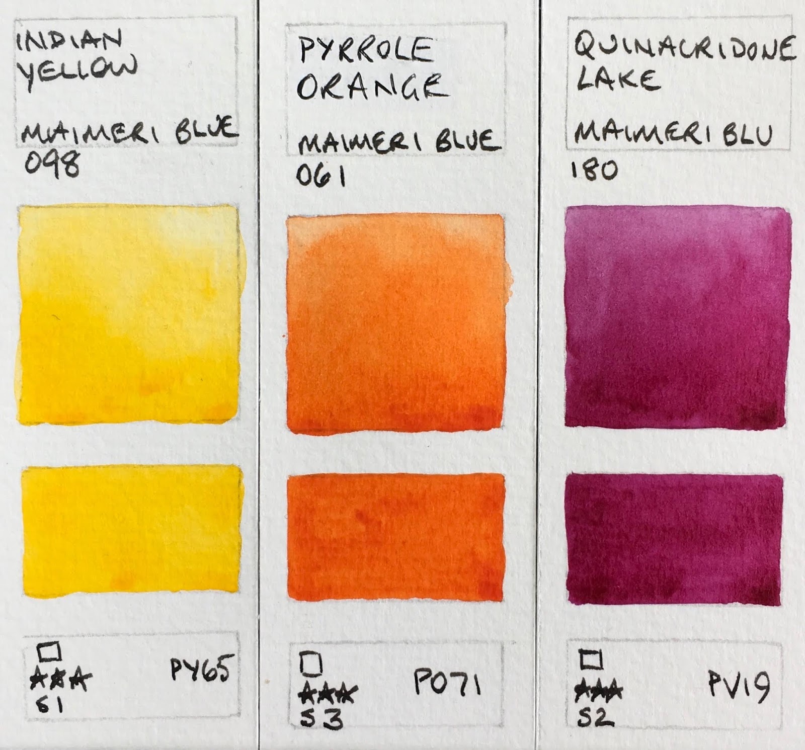 I was checking the links on my blog and website yesterday and saw that my 2017 paint-out of the full Maimeri Blu range is now totally out of date. For reds consider Titan Red or cadmium red light and Quin Red. 100 Maimeri Puro colour.
